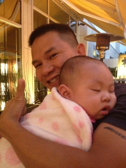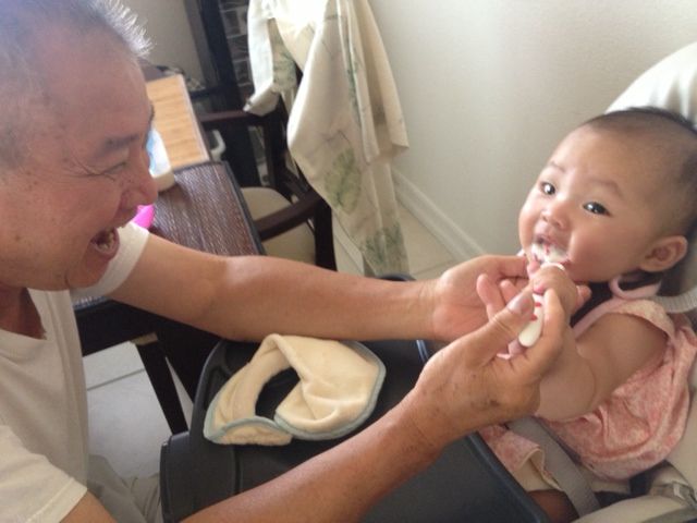 Grandpa feeding Olivia rice. Yummy!